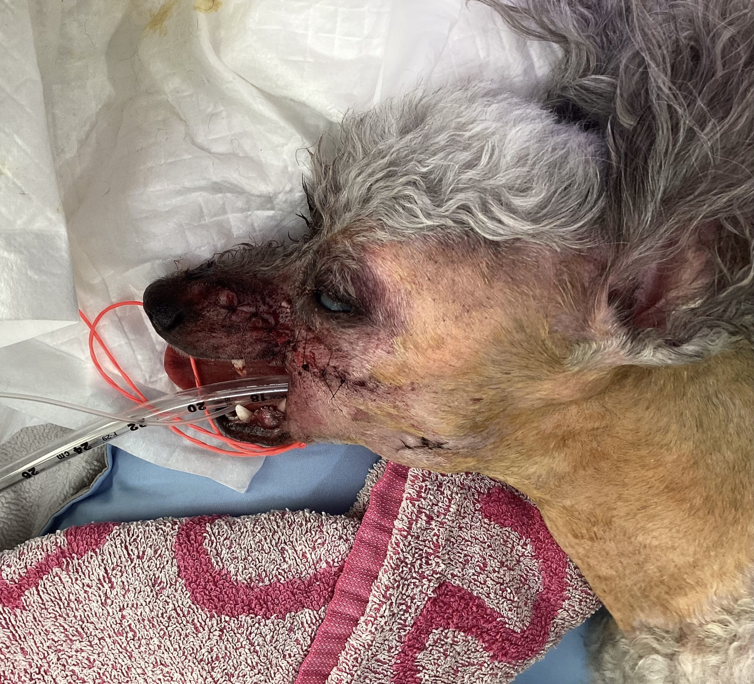 その子に対して、腫瘍の切除、所属リンパ節切除および部分的上顎骨切除術を行いました。
