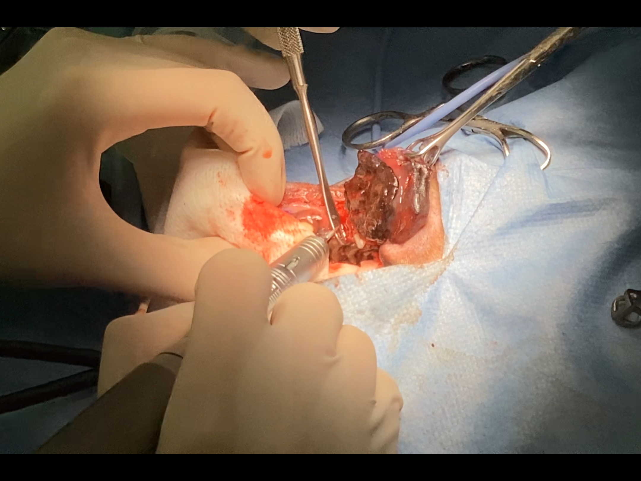 ・腫瘍が固着していると思われる周辺の上顎骨をドリルで切削します