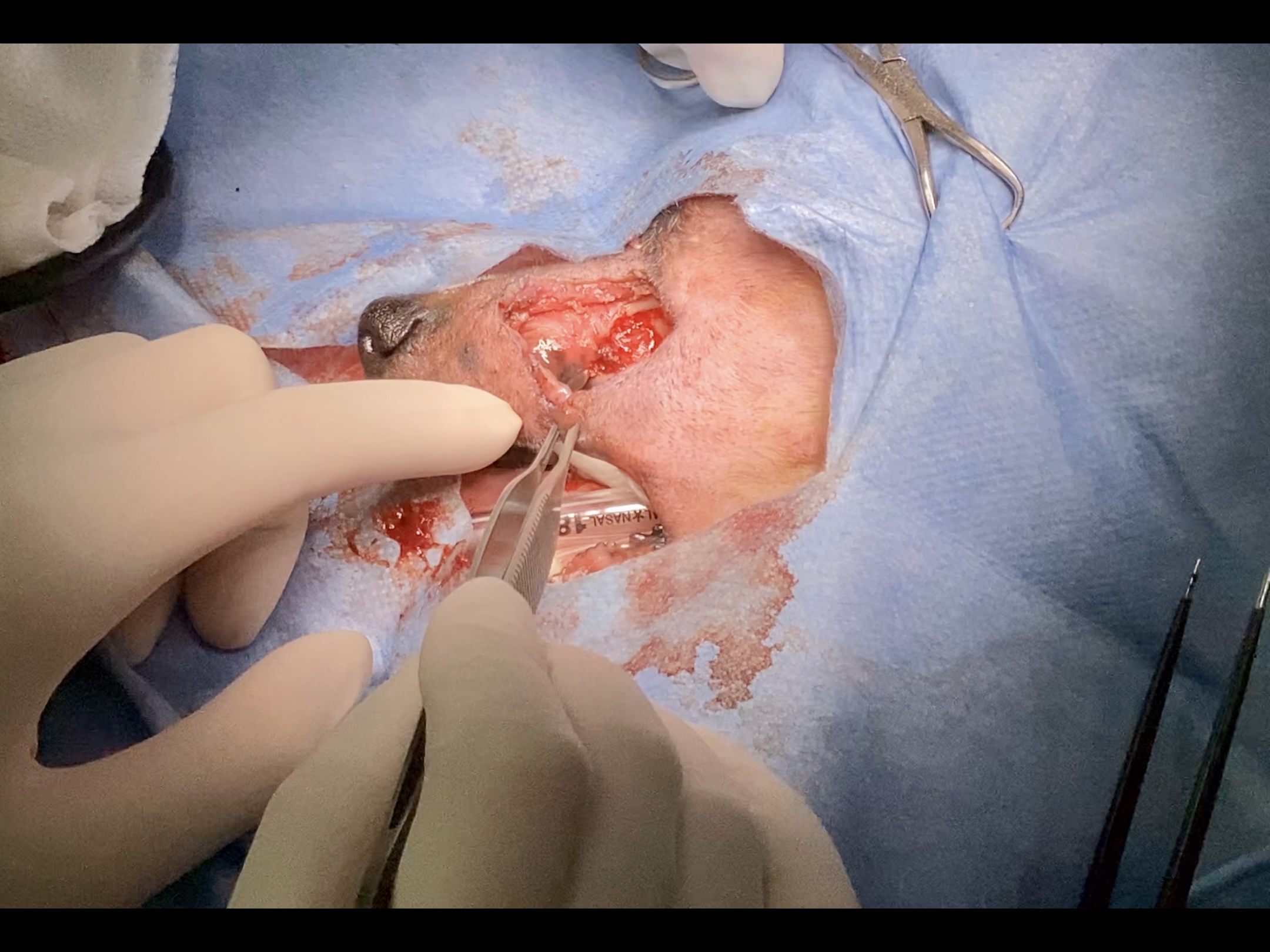 ・口の中と外側からメスで皮膚を切ります